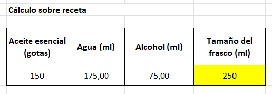 Ahora me faltaba la receta. Saber en qué proporciones tengo que mezclar los ingredientes. Busqué en el libro de «El arte de la aromaterapia» de Robert Tisserand. Encontré varias recetas. Una de ellas es para hacer «agua aromática». Abrí un Excel y me creé mi tabla para hacer los cálculos.