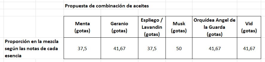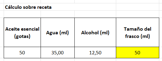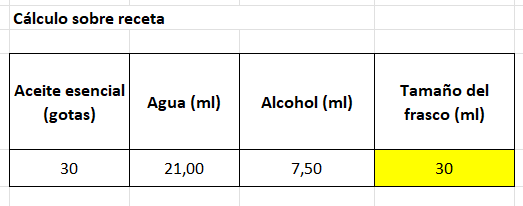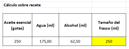 Con esta información me he puesto a calcular en mi hoja Excel cuánta cantidad debería usar de cada esencia para tratar de encontrar un equilibrio del olor de la mezcla. Y también he ajustado la proporción de la dilución global de agua, alcohol y esencias con esta proporción: