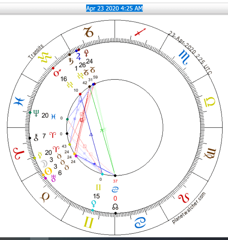 El 23/04/2020 a las 2:25 am horario UTC/GMT ( UTC es Coordinated Universal Time, GMT es Greenwich Mean Time ), según la aplicación de Planet Watcher, se produce la conjunción exacta entre el Sol y la Luna, el punto máximo de la Luna Nueva.
