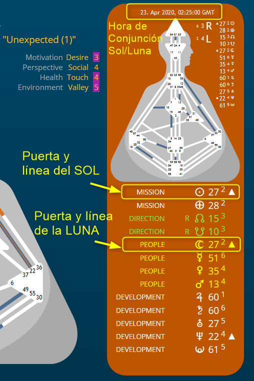 En la aplicación 64Keys con la que trabajo, ¿dónde está situado el Sol y la Luna en la conjunción? En la puerta 27 y línea 2.